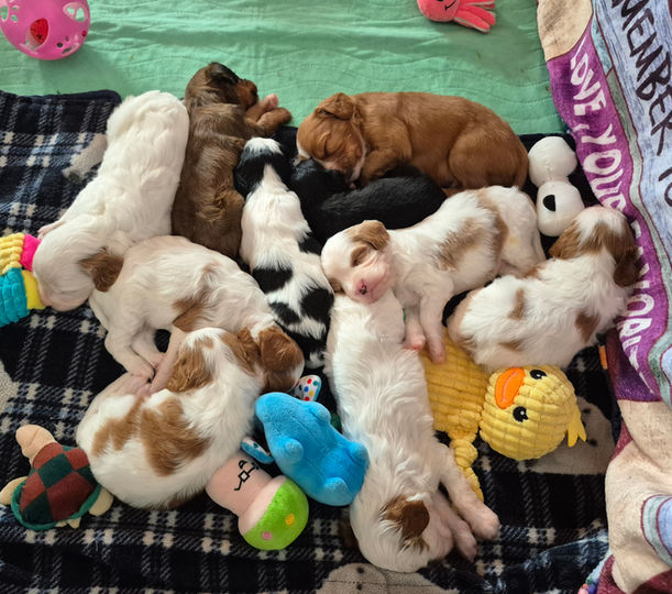 Below are examples of our past "Springalierpoo" puppies, also called "Splash Cavapoos" because they have a "splash" of another spaniel breed in them for health diversity and longevity: